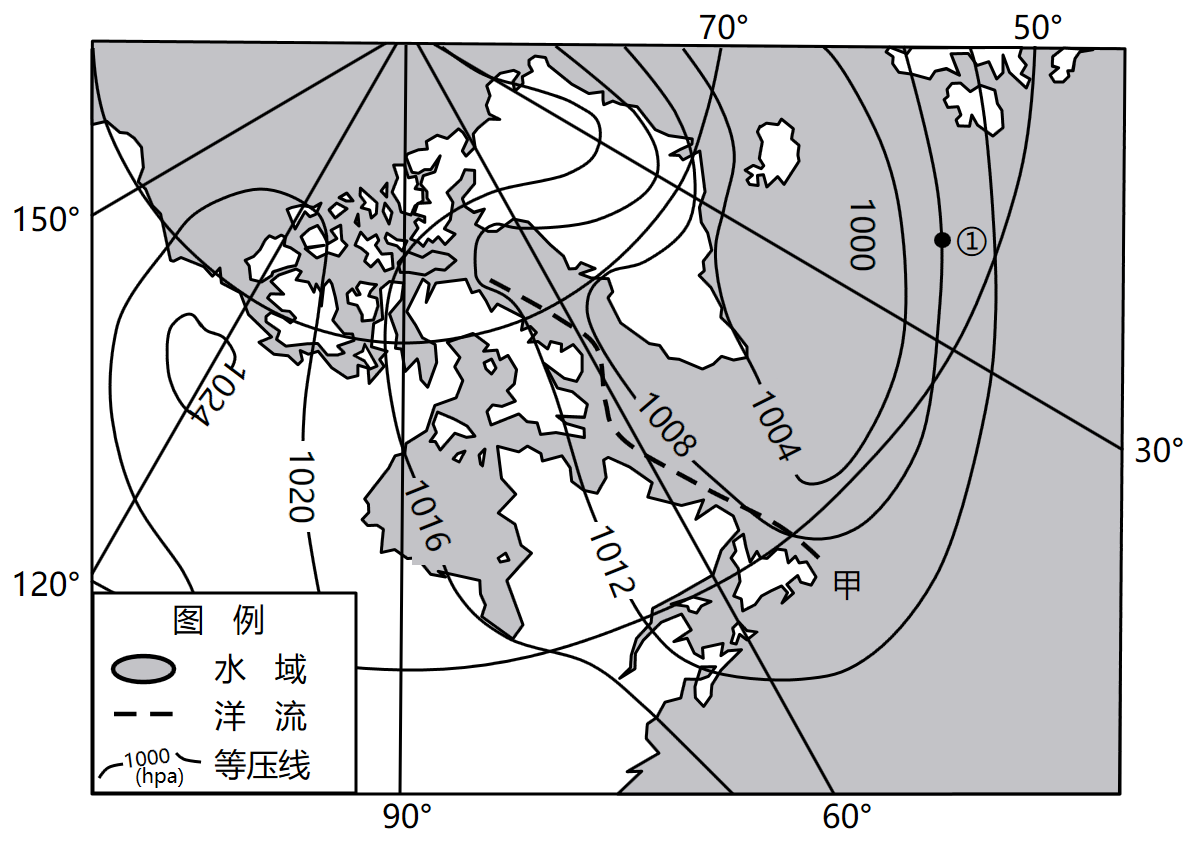 题目8:图中洋流为拉布拉多寒流。寒流会造成流经海区海水温度下降,④错误;甲地位于纽芬兰渔场附近,拉布拉多寒流在甲地附近与墨西哥湾暖流交汇后导致海水搅动,将大洋深层营养物质带到大洋表层,利于浮游生物生长,鱼类饵料丰富,①正确;拉布拉多寒流自北向南流动,会将格陵兰岛附近的浮冰带至甲地,②错误;寒流流经的地区会出现多雾的天气,不利于渔业资源开发,③正确。故选A。