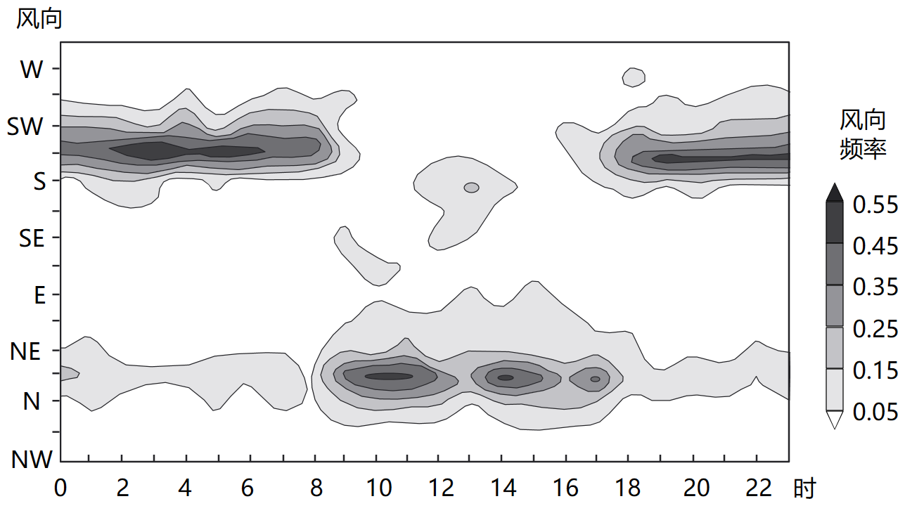 下图为2019年1-3月张家口某气象站典型山谷风风向频率日内分布图。完成下面小题。