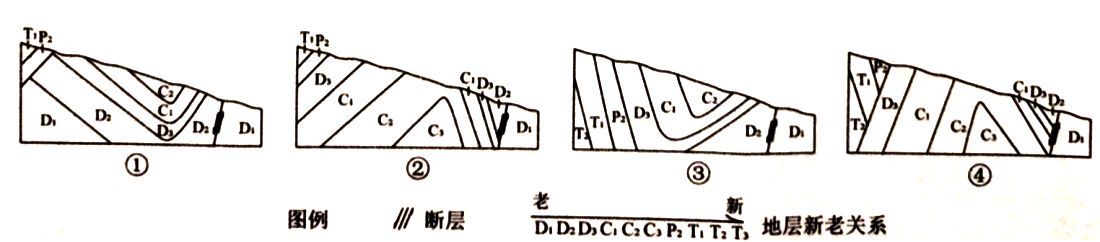 解析:观察图中信息,结合所学知识可知,等高线向高值凸出为山谷,向低值凸出为山脊,图中显示甲乙线从上山脊向山谷下落,再向山谷另一侧爬升一小点距离,结合图中地层新老关系老到新顺序为D1-D2-D3-C1-C2-C3,弯曲方向可知,地层向下弯曲,故排除②和④;图中显示新老关系可知,按照老到新顺序为D1-D2-D3-C1-C2-C3,岩层越老,越在下面,按照图中甲乙走向,山脊下山谷距离较长(也就是甲下坡线地层较长),且T1、P2与D2、D3、C1交错,可判断①正确;图中显示T1、P2与D2、D3、C1交错不平行,但③显示大致平行,故③错误。答案选择A。