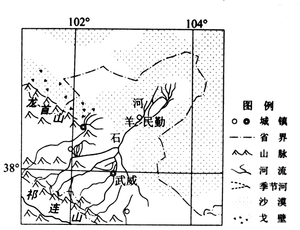 问题1:从内、外流河类型看,该河下游消失于沙漠中,没有流入海,该河为内流河。石羊河发源于祁连山,河流补给类型为高山冰雪融水,夏季气温高,融水多,河流流量最大。该区域位于内陆干旱区,因此水资源是限制因素。