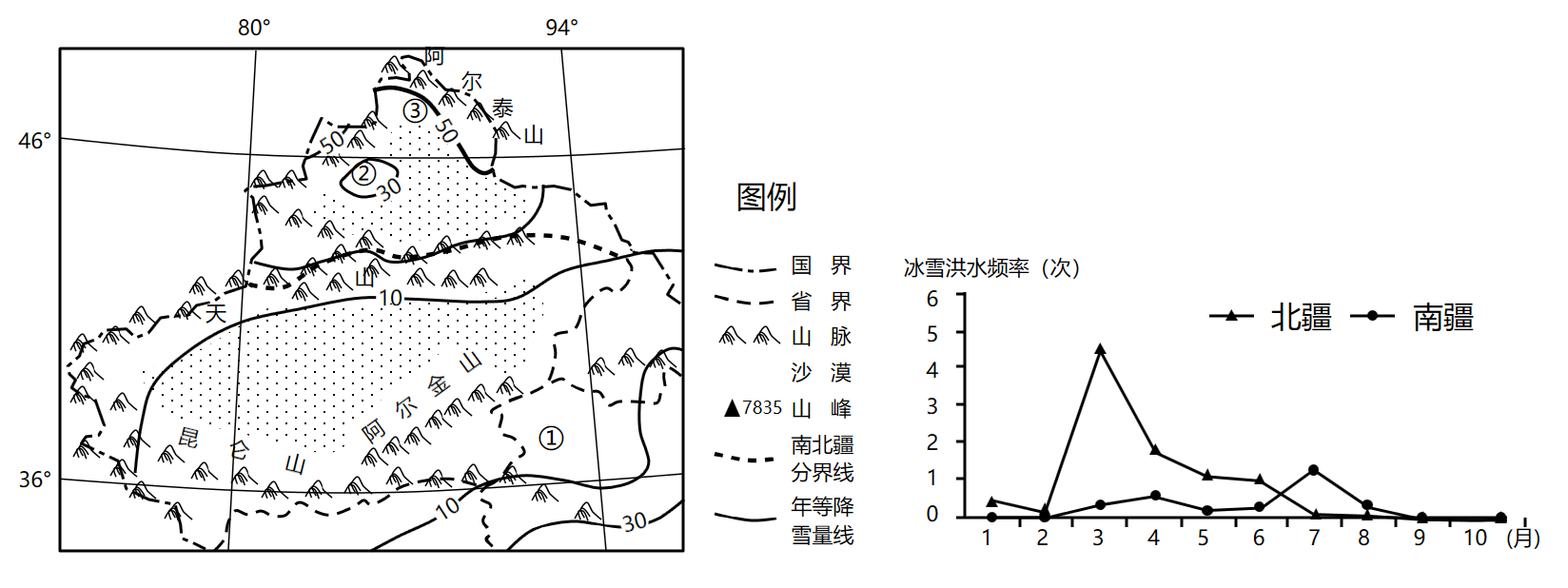 问题2:由图2可知,北疆冰雪洪水频率最高为3月份,一年中春季冰雪洪水频率最高,表明北疆冰雪洪水多发生在3月,与其它季节相比,春汛较明显;与南疆相比,北疆山地海拔不高,高山冰川较少,但是受来自大西洋西风气流影响较显著,冬季山地降雪较多,所以北疆河流多以山地积雪融水补给为主,在春季气温回升时,冬季山地大量积雪消融,补给河流形成洪水。