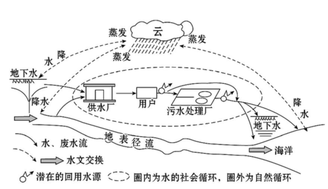 随着人类社会对水的需求日益增大,人类不断大规模地蓄水、引水,极大地改变了水的自然运动状况,这种水在人类社会经济系统中的运动过程即为社会水循环。下图为某地自然和社会水循环示意图。据此完成下面小题。