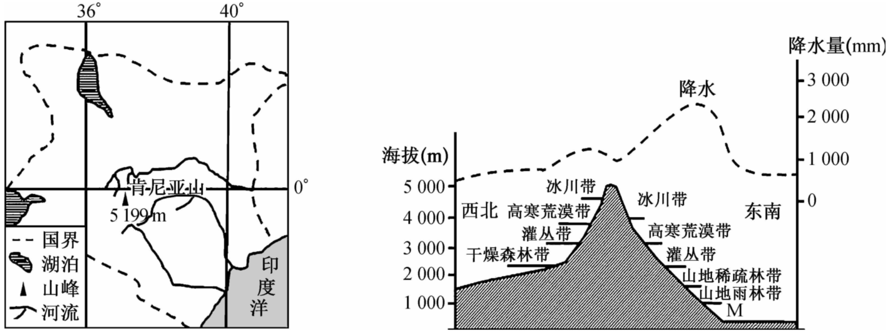解析:结合山地垂直地域分异规律可知,M处自然带是热带草原带,肯尼亚山靠近赤道,但因位于东非高原上,海拔高,气温较低,空气对流不旺盛,降水少,形成了热带草原带。