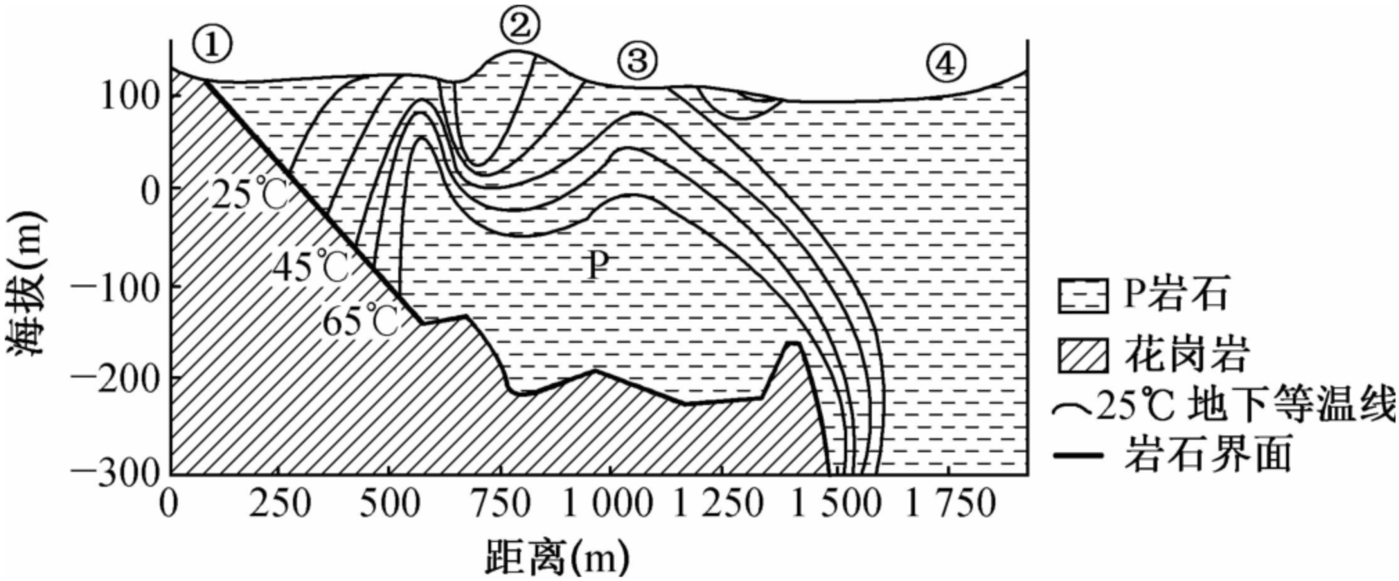 解析:等温线向上弯曲处地热最富集,地热的导体主要是水,可能因该处多断层,岩石破碎多裂隙,受到围岩加热后的地下水顺着裂隙将热量向上传导,导致地下等温线发生弯曲;若发生褶皱,岩层也会发生弯曲。
