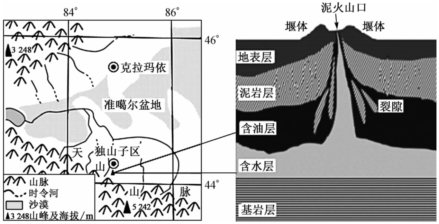 独山子区位于天山与准噶尔盆地的背斜过渡带,其南部一座孤山上有多个泥火山口。泥火山是泥浆与气体同时喷出地面后堆积而成,近年来,泥火山口有石油涌出地表,形成独特的石油泉涌景观。泥火山土壤含碱含盐大,周围寸草不生,唯独石油泉口的堰体周围生长着一圈绿色植物。下图示意独山子区的地理位置及石油泉涌地质剖面。