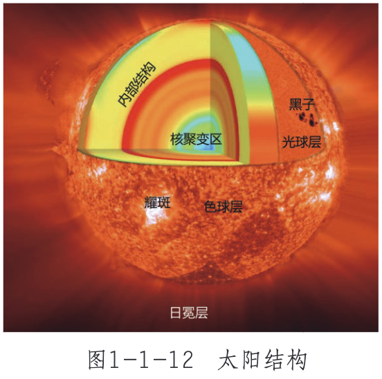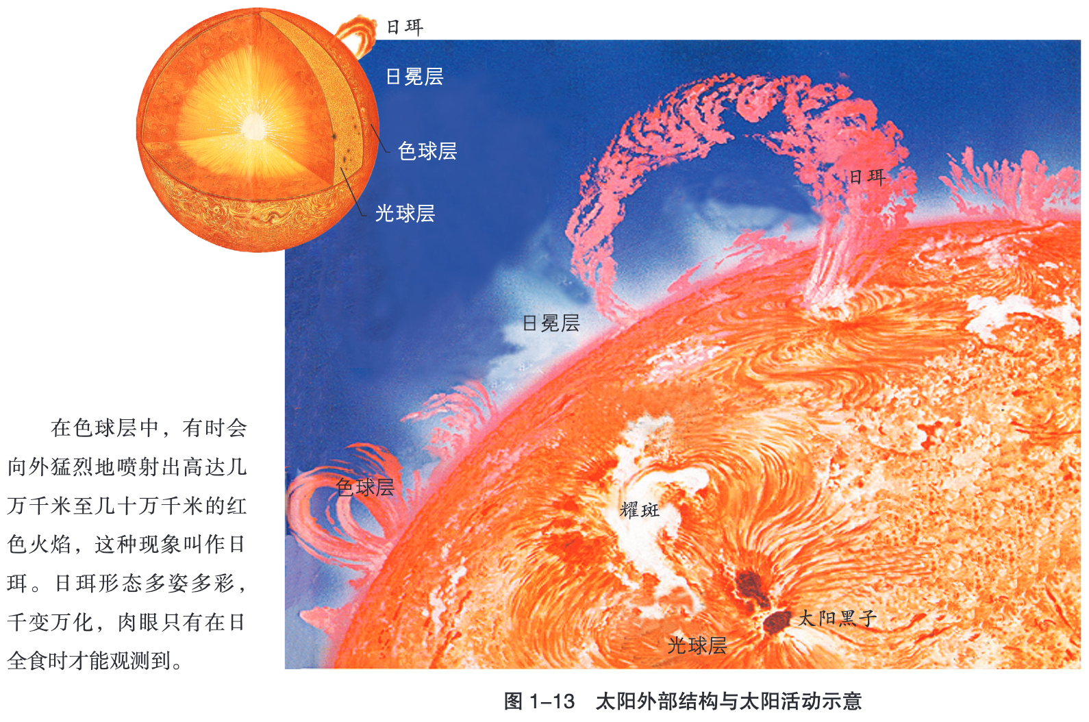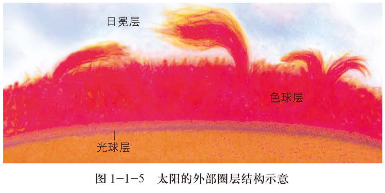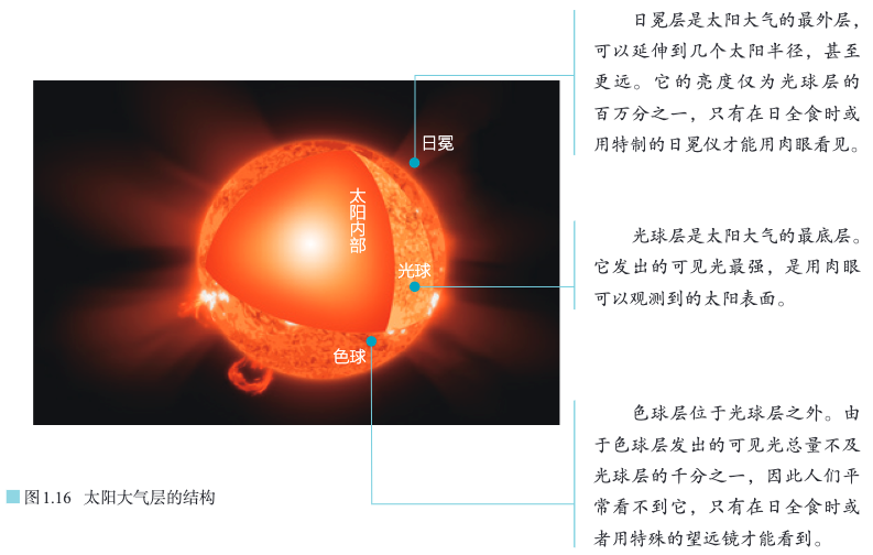 太阳的大气层,是人类能观测到的太阳的部分,从里到外分为光球、色球和日冕三个圈层(图 1.16)。