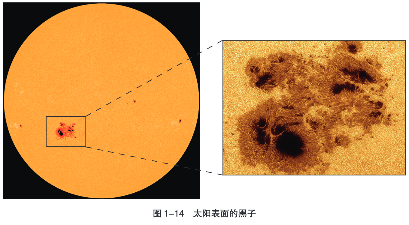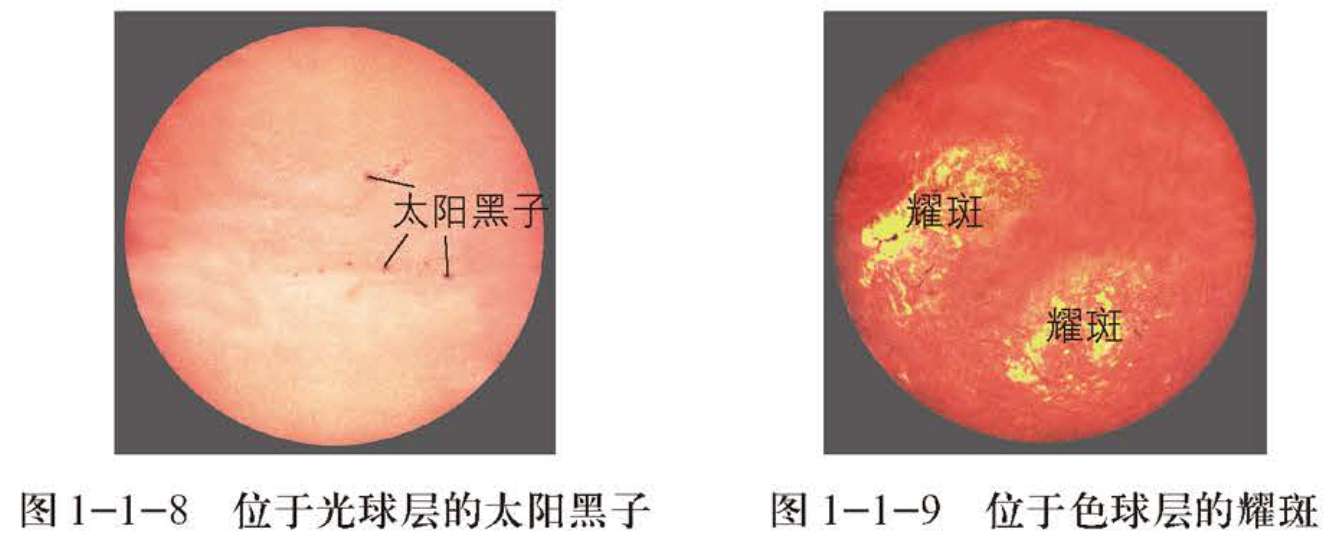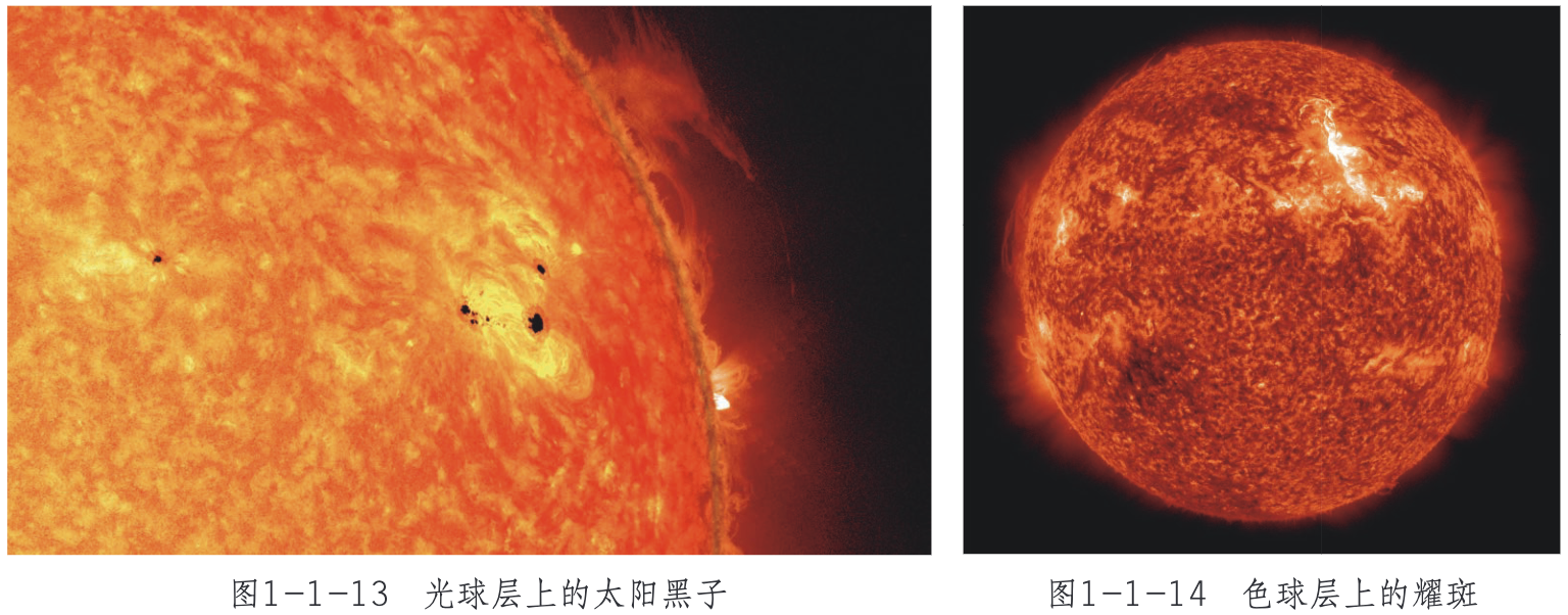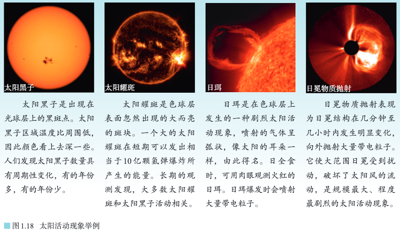 太阳大气的变化称为太阳活动。太阳活动现象较多,主要有太阳黑子、太阳耀斑、日珥、日冕物质抛射等(图1.18),它们之间常有密切的联系。太阳黑子的多少和大小,可以作为太阳活动强弱的标志。太阳耀斑、日珥、日冕物质抛射等是剧烈的太阳活动现象。