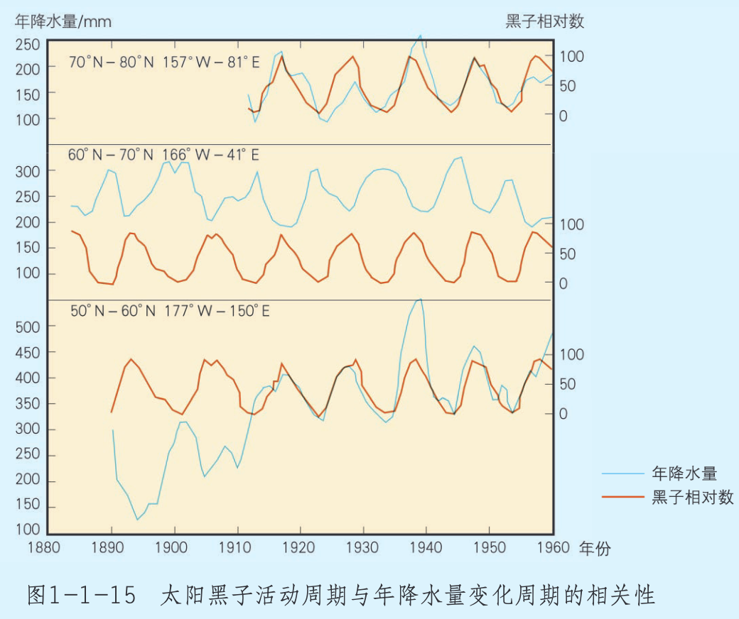 读图1-1-15,比较太阳黑子相对数与三个地区降水量关系的差异。在此基础上,归纳太阳活动对气候的影响。