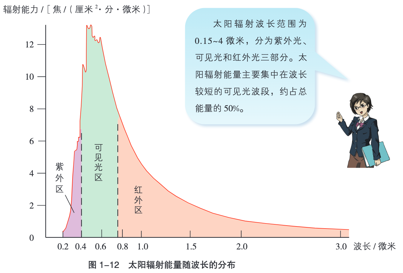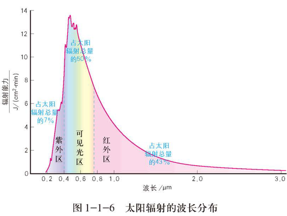 太阳辐射的电磁波波长范围主要在0.15~4.0微米,其中波长在0.4~0.76微米的称为可见光。太阳辐射能主要集中在可见光部分,约占太阳辐射总量的50%。