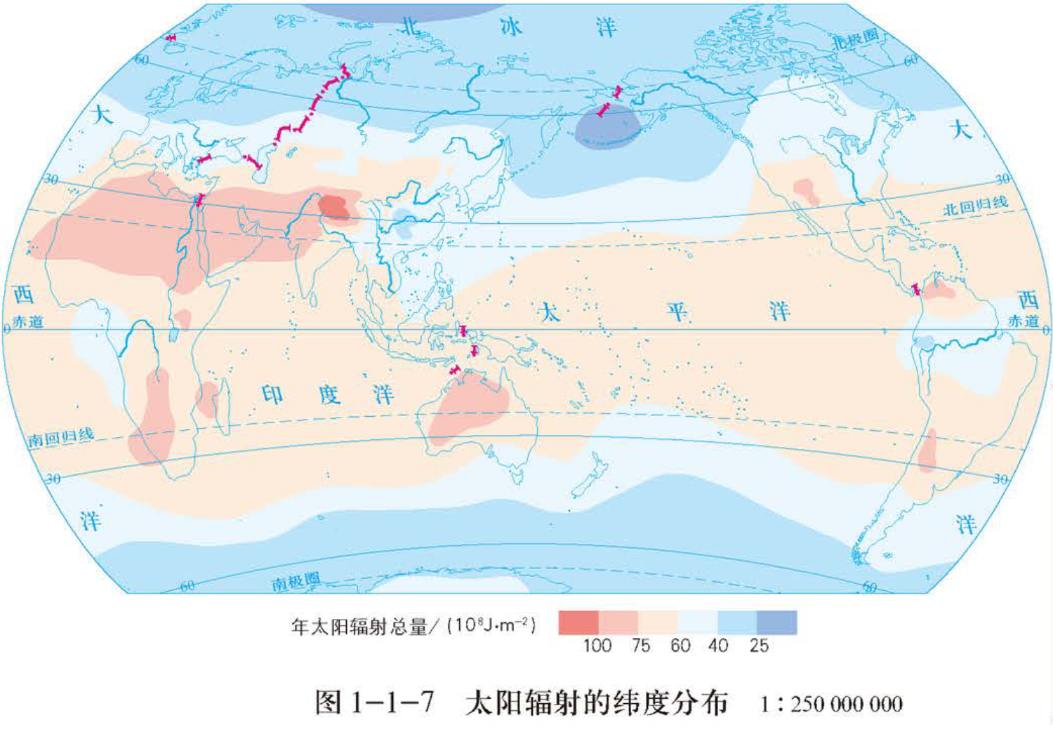 读图1-1-7,分析太阳辐射的纬度分布规律,试用太阳辐射的纬度分布来解释自然景观沿纬度方向的变化。