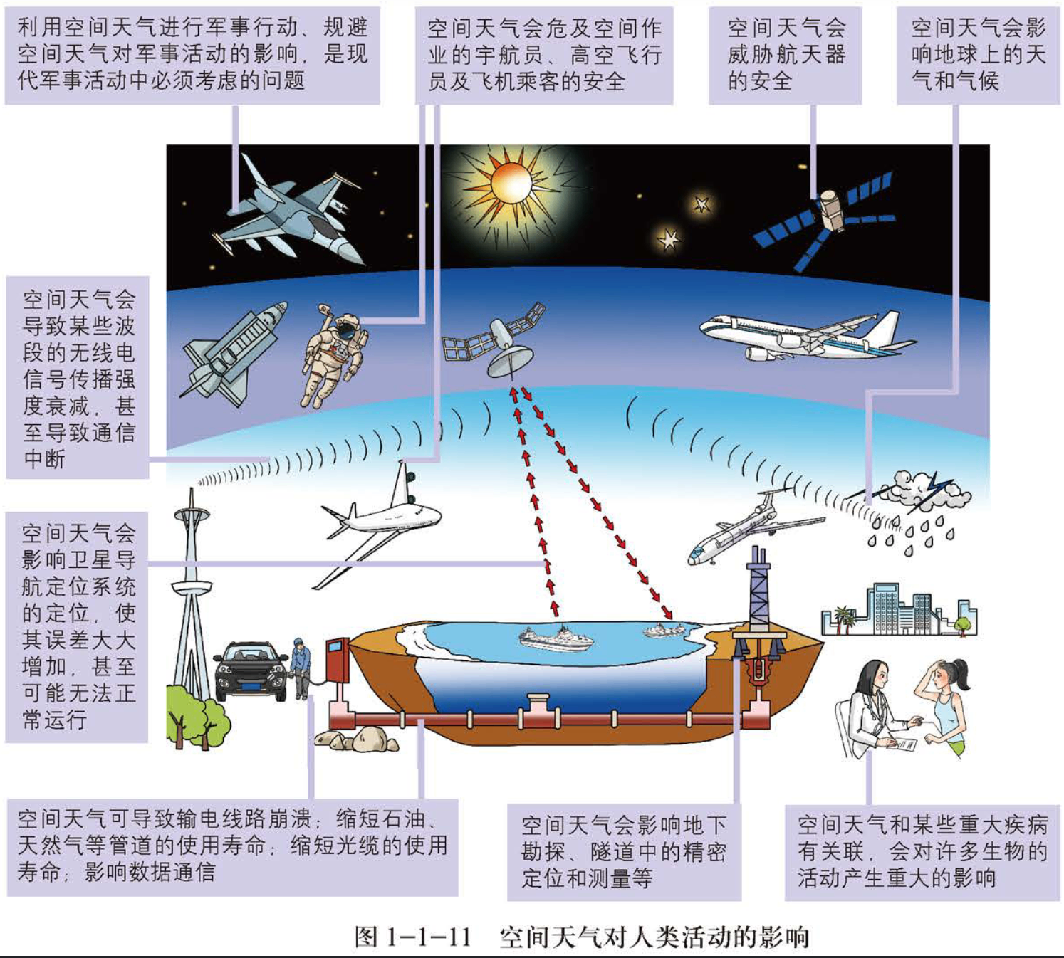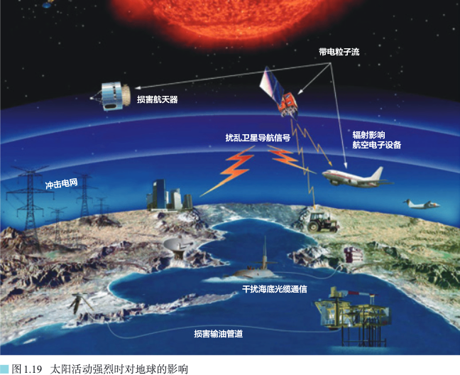 太阳活动对地球有显著的影响。当太阳活动增强时太阳风变得强劲,会扰动地球的磁场和大气层,产生磁暴极光等现象。当这种扰动足够强烈时,还会对卫星导航、空间通信、电网、航空航天等人类活动产生灾害性的影响(图1.19)。