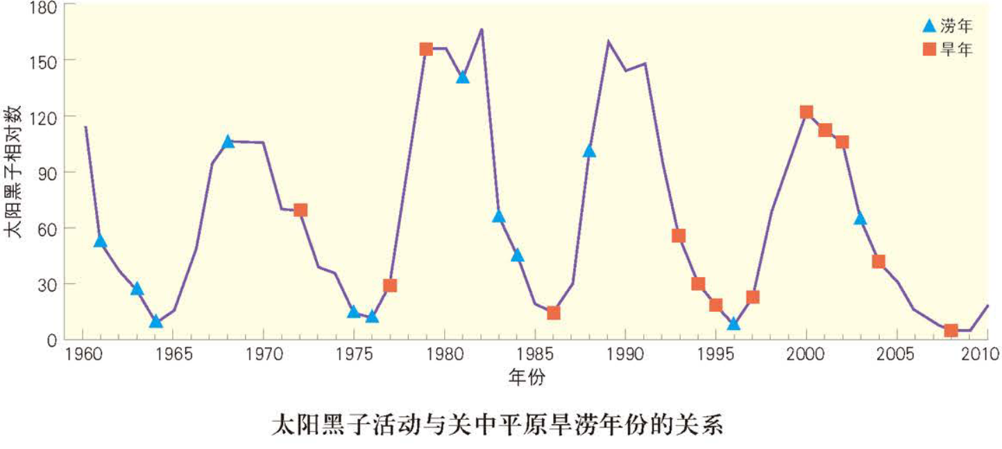 我国学者通过对 1960-2010 年太阳黑子活动周期与陕西省关中平原旱涝年份关系的研究,分析出太阳黑子活动与关中平原发生旱涝灾害的时期有一定的关联。