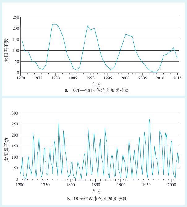 太阳黑子的变化周期一般被认为是太阳活动的周期。图1.20的a、b两图表示不同尺度的时间段内太阳黑子数的变化情况。