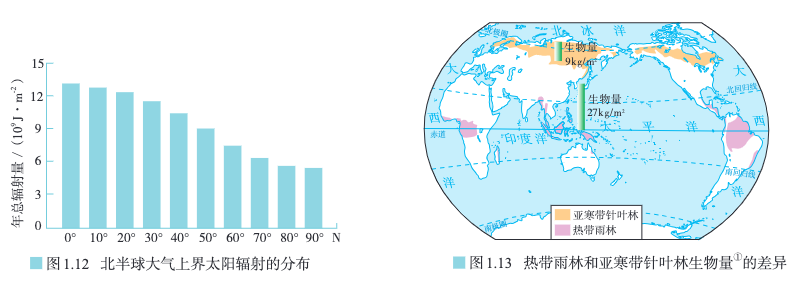 太阳辐射为地球提供光和热,维持着地表温度,是地球上水、大气运动和生命活动的主要动力。地球不同纬度地带接受的太阳辐射能不同(图1.12),使得许多自然地理现象早现纬度地带的差异(图 1.13)。