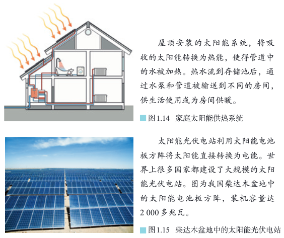 太阳辐射为我们生活、生产提供能量。太阳辐射除了直接被吸收、转化成热能外(图1.14),还可以被捕获并存储,转换成热能、电能等(图1.15)。人们大量使用的煤、石油等矿物燃料是地质历史时期生物固定并积累的太阳能。