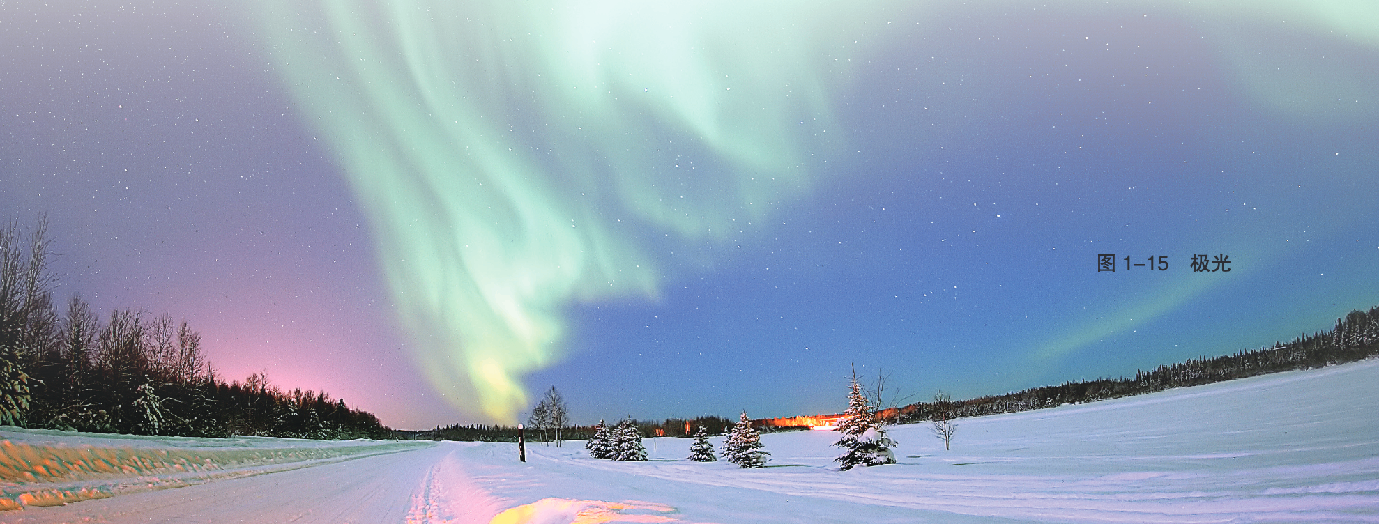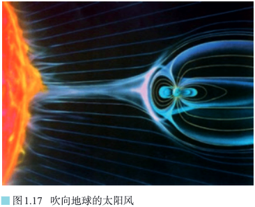 同70万千米的太阳半径相比,光球层和色球层都非常薄,但日冕层一直向星际空间延伸。太阳大气不断释放高速带电粒子流,这种带电粒子流被称为太阳风(图1.17)。正常情况下,地球的磁场能够阻挡太阳风,使地球免受太阳风的危害。