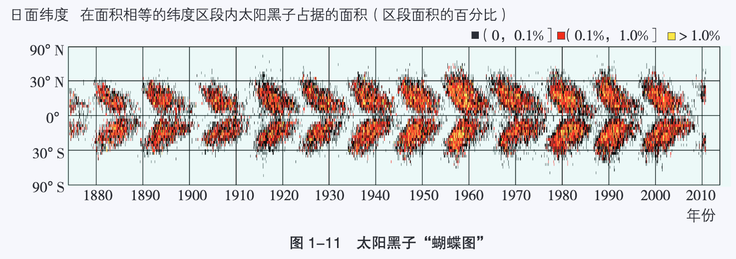 19 世纪 40年代,德国天文爱好者施瓦布发现了太阳黑子活动 10~11年的周期变化规律。通过长期的观测,人们还发现太阳黑子在日面上的活动,随时间的变化,其纬度分布也具有规律性:每当一个太阳黑子周期开始时,最先出现的黑子总是在距离太阳赤道较远处(平均纬度为 35°),然后向低纬度方向移动,最终黑子出现的位置逐渐靠近太阳赤道。