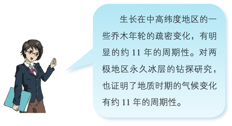 太阳活动对地球气候的影响 地球上的气候变化与太阳黑子活动有一定的对应关系。研究发现,亚寒带许多高龄树木年轮的疏密变化规律,恰好与太阳黑子约11年的活动周期相吻合。据统计,凡是太阳黑子活动的峰年和谷年,地球上出现异常气候的概率就明显地增加;而在其他年份,地球上的气候状况相对比较正常。