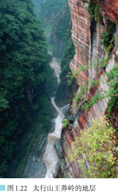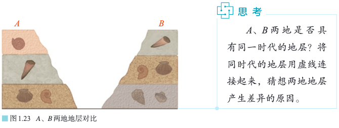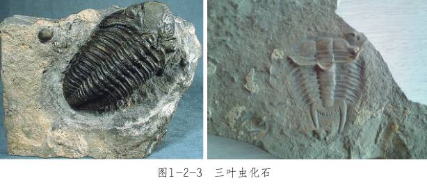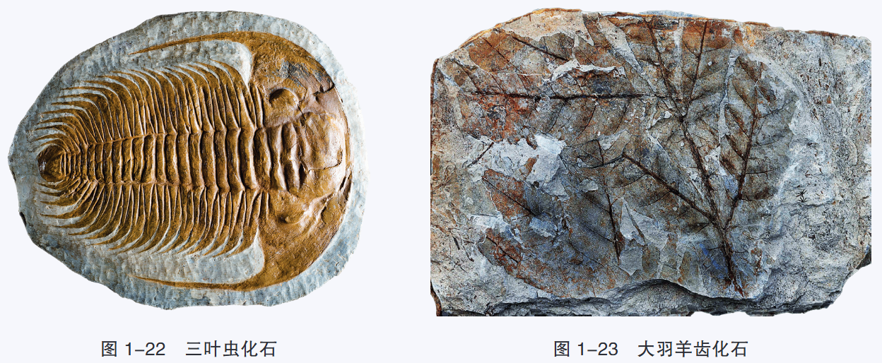 地层是具有时间顺序的层状岩石(图1.22)。沉积岩的地层具有明显的层理构造,一般先沉积的层在下,后沉积的层在上。在沉积岩的形成过程中,有些生物的遗体或遗迹会在沉积物中保存下来,形成化石,所以同一时代的地层往往含有相同或者相似的化石(图1.23)。生物总是从低级向高级、从简单向复杂进化的,因此,越古老的地层含有越低级、越简单生物的化石。