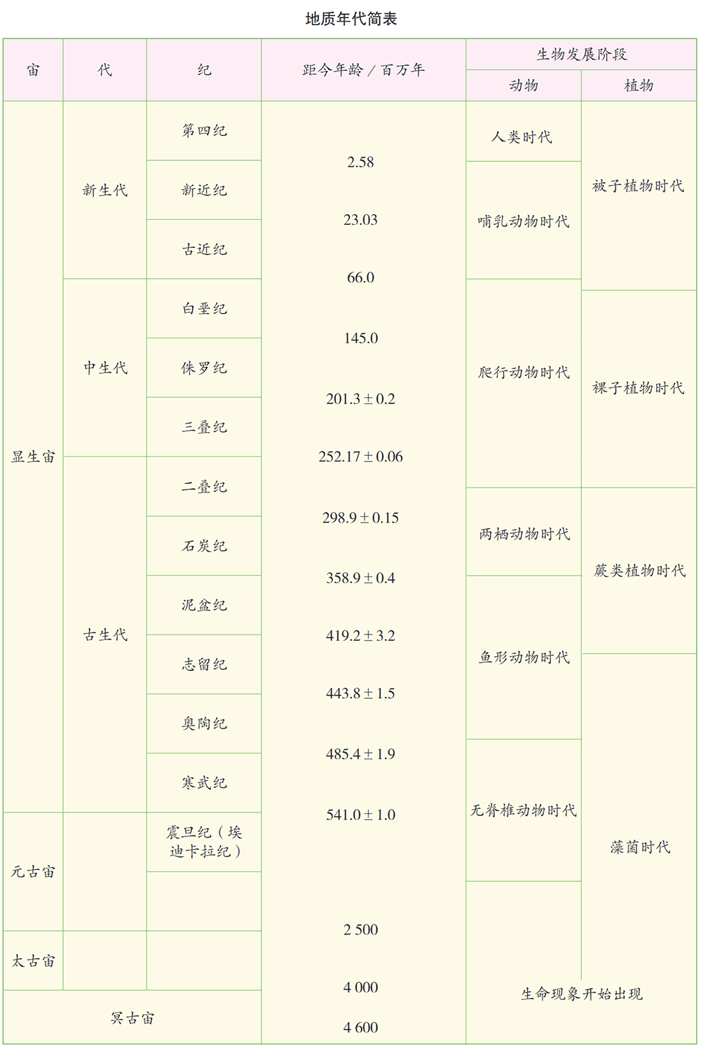 名词解释:从1881年地质年代表的基本划分单元被确定以来,地质年代表就一直处于补充和完善中。本书中地质年代的划分来源于国际地层委员会2018年发布的《国际年代地层表》。