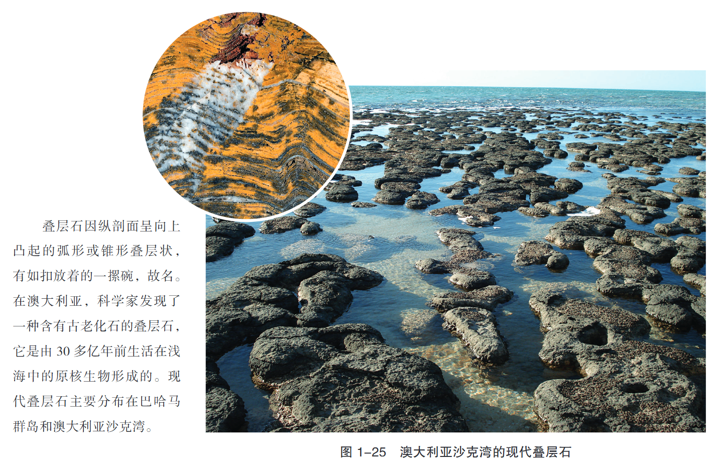 生命的出现和演化与大气层中氧气的增多密不可分。地球形成之初,大气的主要成分是二氧化碳、一氧化碳、甲烷和氨,缺少氧气。冥古宙时期,地球上只有一些有机质没有生命的迹象。到了太古宙时期出现了蓝细菌(图1.25)等原核生物。蓝细菌能够通过光合作用制造氧气。元古宙时,蓝细菌大爆发,大气成分开始发生改变,生物也因此得到进一步发展,演化出真核生物和多细胞生物。