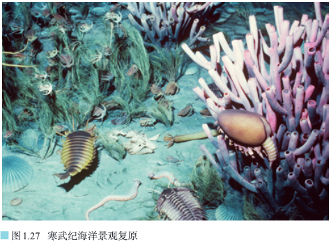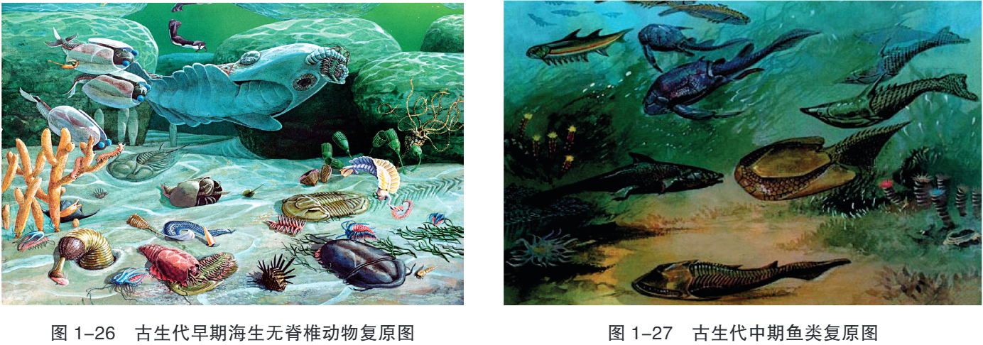 早古生代是海洋无脊椎动物发展的时代(图1.27)。早期,地球上海洋面积远大于现在,海洋无脊椎动物空前繁盛,温暖的海水里出现了多种动物,如三叶虫、笔石、鹦鹉螺等。到了后期,海洋面积缩小,陆地上开始出现低等的植物,但海洋仍是无脊椎动物的世界。