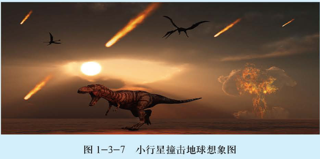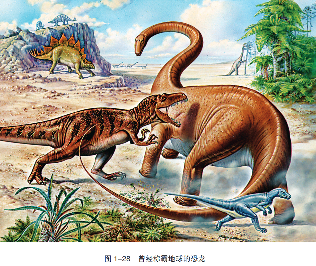中生代是爬行动物繁盛的时代,其中最有名的爬行动物当属恐龙。恐龙出现于三叠纪,兴盛于侏罗纪,是陆生脊椎动物。恐龙头部较小,颈和尾一般较长,有用四足行走的,也有只用两足行走的。恐龙种类繁多,形态各异,大的有几十米长,小的只有鸡那么大;有肉食性的,也有植食性的,还有杂食性的。恐龙大多生活在陆地上或湖沼中。距今6 500万年前的白垩纪末期,包括恐龙在内的75%~80%的物种灭绝,长达约1.4亿年之久的恐龙时代随之终结。关于这次生物大灭绝的原因,有多种假说-——“ 气候变迁说”“地磁变化说”“陨石撞击说”“酸雨说”“被子植物中毒说”等,其中“陨石撞击说”得到了较多科学家的认可。