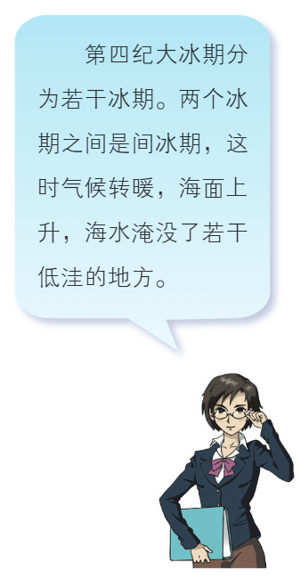 第四纪时期,全球出现数次冷暖交替变化。气候寒冷期,冰川范围扩大,海平面下降,许多生物向较低纬度迁移;气候温暖期,冰川范围缩小,海平面上升,海水浸没了若干低洼的地方。目前,地球处于一个温暖期。