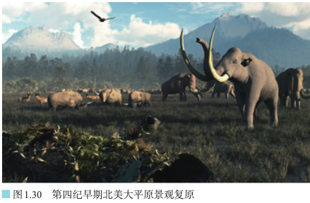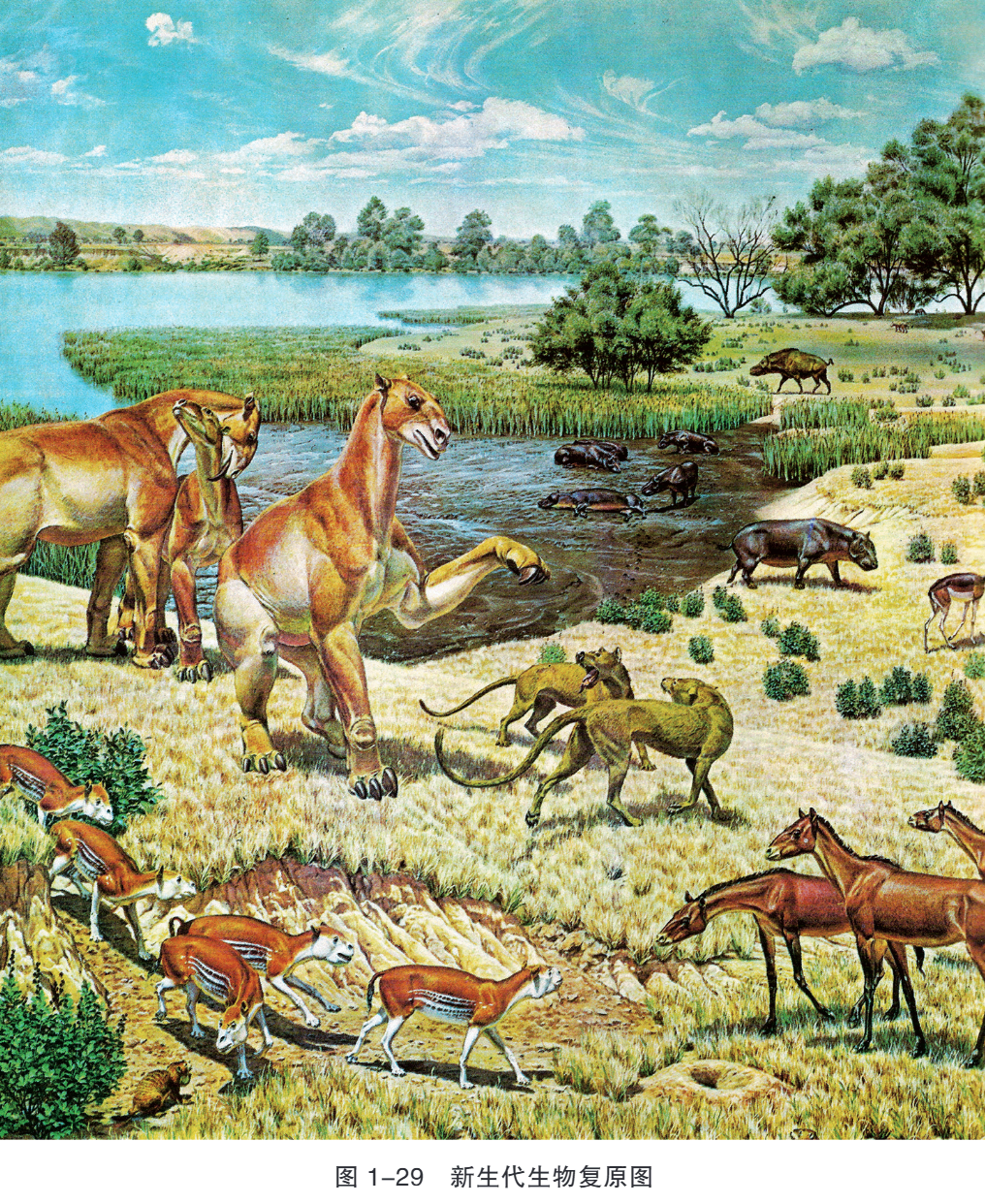 新生代(距今6600万年至今)是“最近的生物时代”,分为古近纪、新近纪和第四纪。联合古陆在新生代最终解体,各大陆板块漂移到现在的位置,形成了现代海陆分布格局。这时期地壳运动剧烈,形成了现代地势起伏的基本面貌,如今地球上一些高大山脉如阿尔卑斯山脉、喜马拉雅山脉、落基山脉、安第斯山脉等都是在这一时期形成的。新生代被子植物高度繁盛,草原面积扩大,哺乳动物快速发展,生物界逐渐呈现现代面貌(图 1.30)。第四纪出现了人类,这是生物发展史上的重大飞跃。