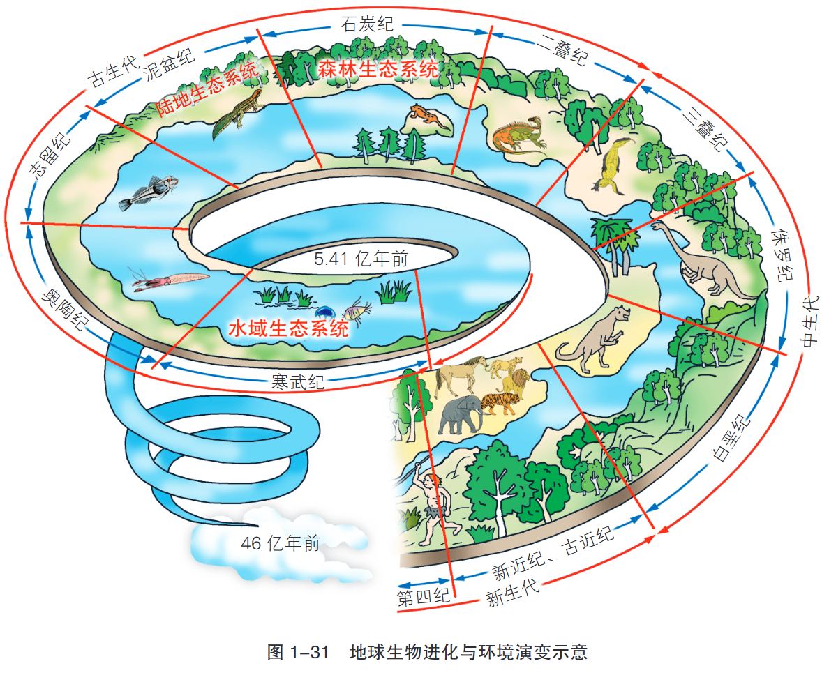 2. 图 1-31 表示的是地球生物进化与环境演变示意。地球的演化是一个系统有序的过程,全球环境演变、自然灾害发生、海平面上升、气候变暖、臭氧空洞扩大等与地球内部的各种过程密切相关。对人类未来生存环境的关心,迫使科学家不得不从多个角度去探讨可能的致变因素。议一议,科学家为什么要这样做?他们的担忧是杞人忧天吗?