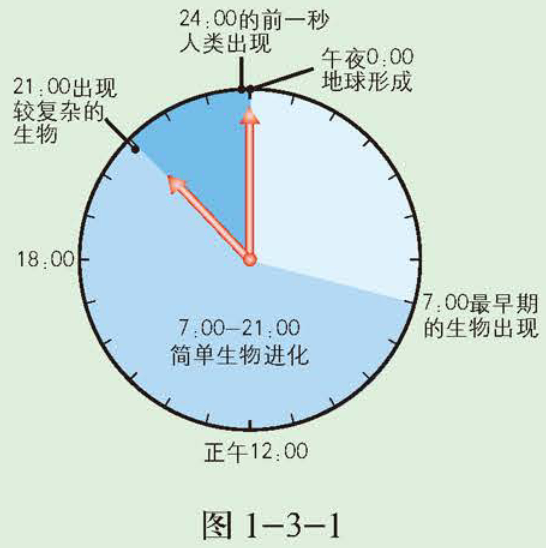 如果把地球自“诞生”之日至今的演化过程看作24小时的话,那么地球形成于午夜0:00。7小时后,早期的单细胞生物出现了。再经过14个小时,单细胞生物进化为简单的软体动物,如水母和蠕虫。21:00以后,更大型的、较复杂的生物在海洋里得以进化。爬行类动物和昆虫类在22:00首次出现。恐龙直到23:00才出现,但到了23:30就已经灭绝了。人类(晚期智人)是在午夜24:00的前1秒出现的。