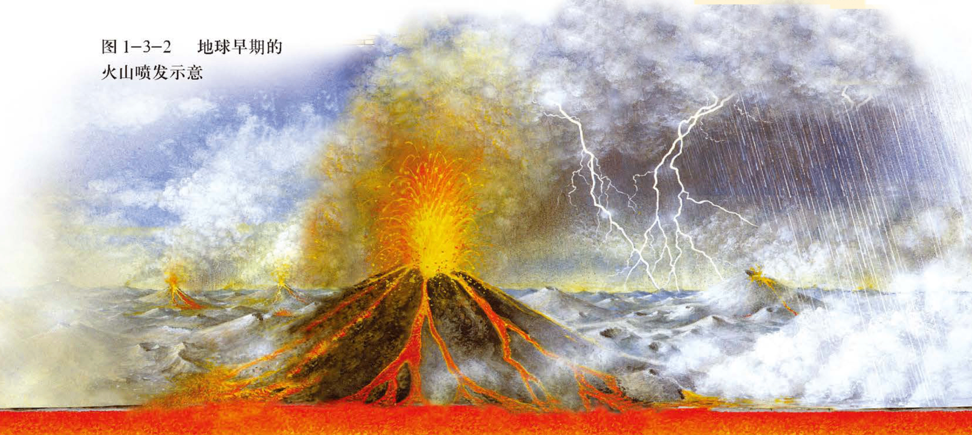 广泛发生的火山喷发,释放出水蒸气、二氧化碳等气体,构成了原始的大气圈。随着地表温度下降,气态水发生凝结,通过降雨落到地面,形成由河流、湖泊和海洋等组成的水圈。