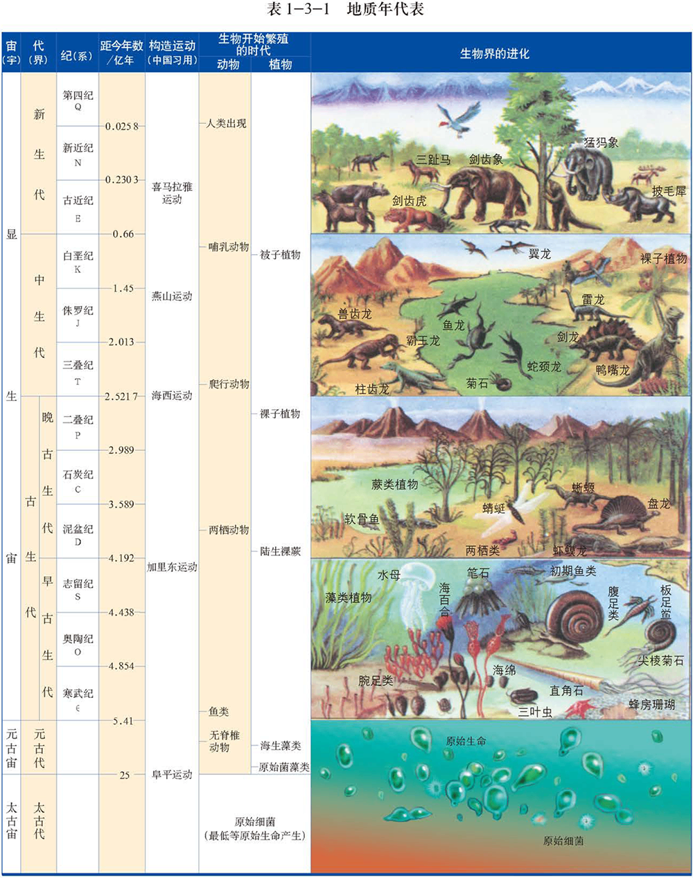 读表:阅读地质年代表,熟悉各地质年代的名称、距今年数、主要构造运动和代表性动植物。