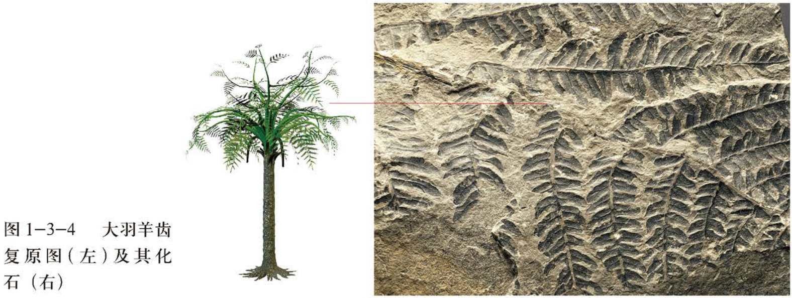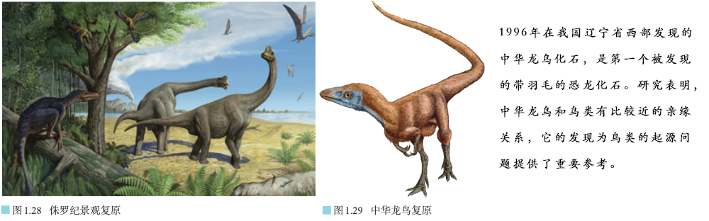 这一时期爬行动物盛行,尤其是忍龙,在侏罗纪和白垩纪达到了大繁盛,因此中生代也被称为“爬行动物的时代”(图1.28)。中后期,一些爬行动物进化出羽毛,开始向鸟类发展(图1.29);小型哺乳动物出现。裸子植物在中生代极度兴盛,在陆地植物中占主要地位。中生代也是主要的成煤期。