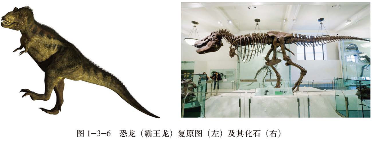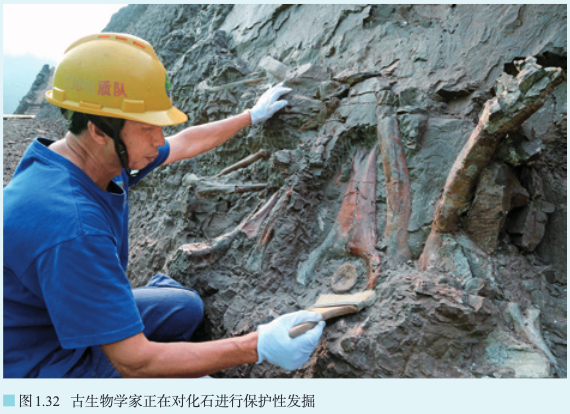 你或许看过有关恐龙的电影,或者在博物馆参观过恐龙化石或模型,而恐龙早已灭绝,我们如何了解这些庞然大物呢?多亏古生物学家,他们发现并研究化石(图1.32),复原了这些曾经生活在地球上的生物。那么,古生物学家是如何开展研究的呢?