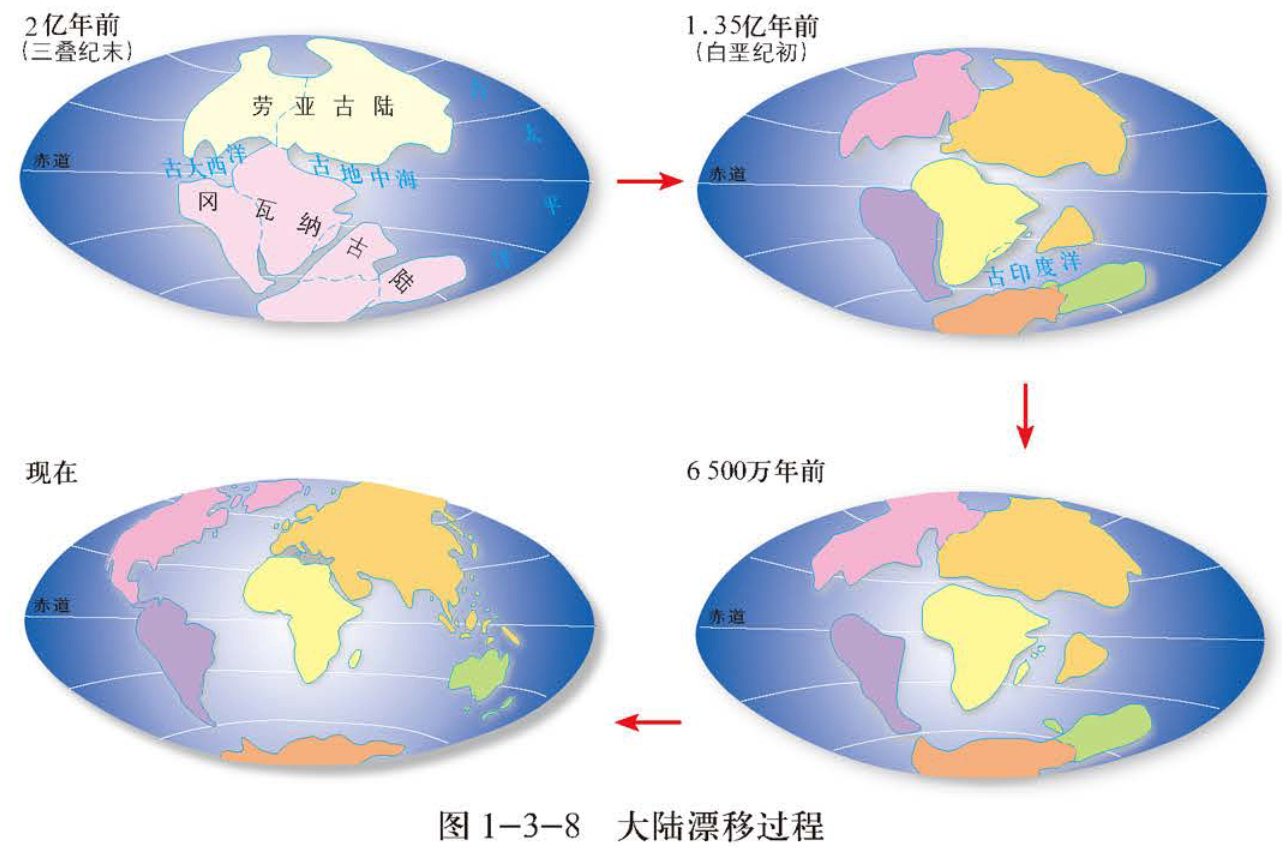 由于板块运动剧烈,联合古陆在三叠纪晚期开始解体,各大陆向现在的位置漂移。