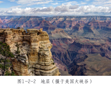 地质历史上一定地质时期形成的各种成层岩石和堆积物叫地层。在未受剧烈构造运动①扰动的情况下,先形成的地层居下,后形成的地层居上。地层的性质,在一定程度上反映了地层形成时的地表环境。例如,石灰岩主要形成于浅海环境,页岩形成于静水环境,玄武岩则是火山活动的产物。