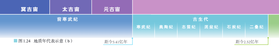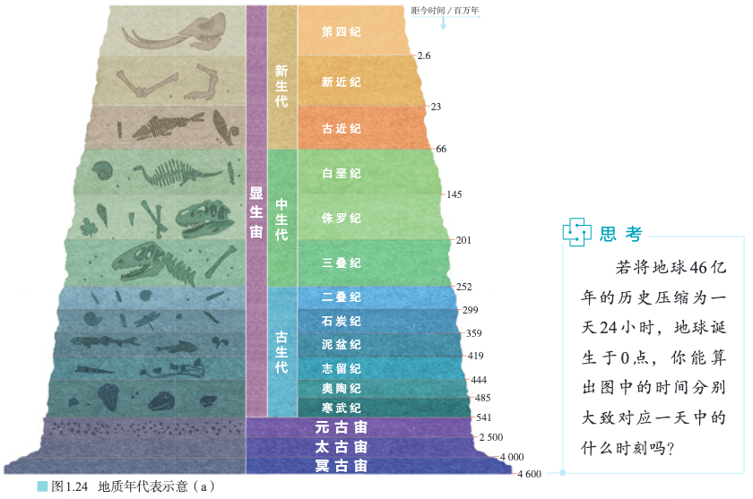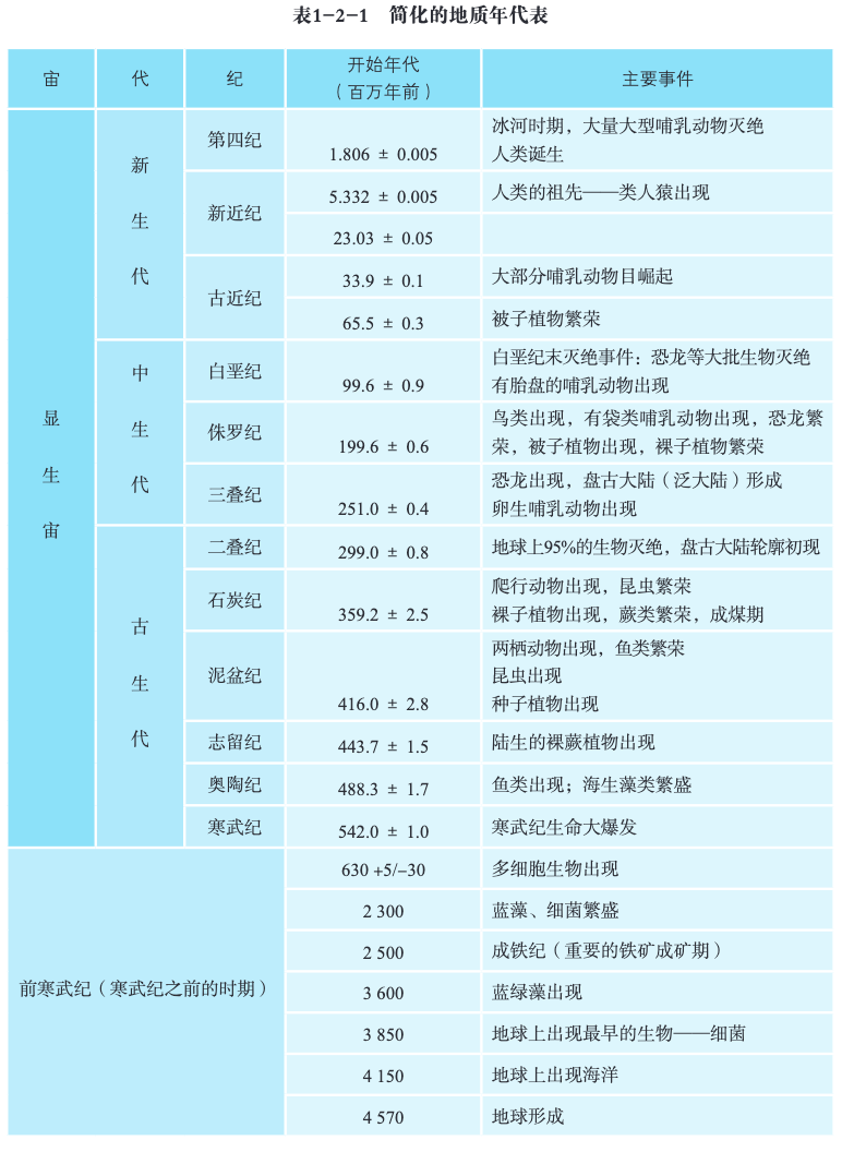 科学家对全球各地的地层和古生物化石进行了对比研究,发现地球演化呈现明显的阶段性。根据地层顺序、生物演化阶段、岩石年龄等,科学家把漫长的地球历史按照宙代、纪等时间单位,进行系统性编年,这就是地质年代表(图1.24)。