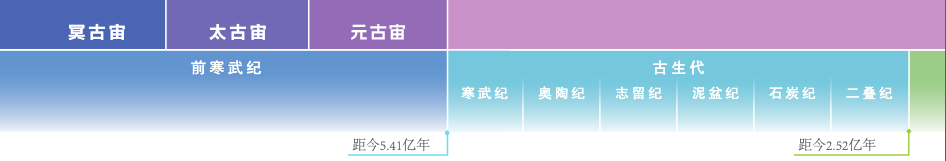 古生代(距今5.41亿年-2.52亿年)意为“远古的生物时代”,可分为早古生代和晚古生代。其中早古生代包括寒武纪、奥陶纪、志留纪,晚古生代包括泥盆纪、石炭纪和二叠纪。