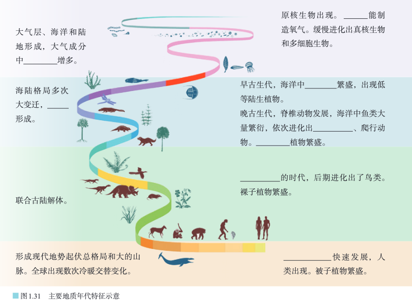 将以下选项分别填入图1.31中的文字空白中,以完成关于不同地质年代的地球环境和生命现象的描述。