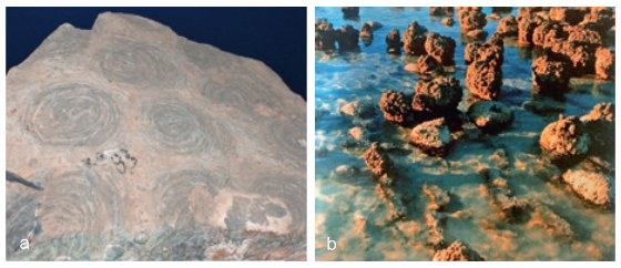 蓝细菌在生长过程中能黏附海水中细小的沉积物,当沉积物增多,蓝细菌需要移动到表层来寻找光源进行代谢。这样,沉积物一层一层地堆积,就形成了垫状或垛状的岩石结构,称为叠层石。图 a 为安徽宿州元古宙的叠层石,图 b 为澳大利亚西部沙克湾现存的叠层石。