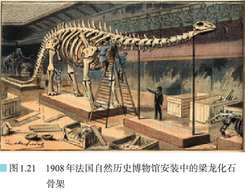 作为最容易辨认的恐龙之一,梁龙(图1.21)是巨型恐龙中的明星,它们体型巨大,最大的身长超过36米,脖子长度超过6米,尾巴长度更在10米以上。1.5亿年前,在北美洲大平原上,它们是最常见的巨型恐龙。然而,现在人们只能在博物馆通过化石骨架来认识它们。身材这么庞大的动物为什么没能继续在地球上生存下来呢?地球的环境都发生过什么样的变化?