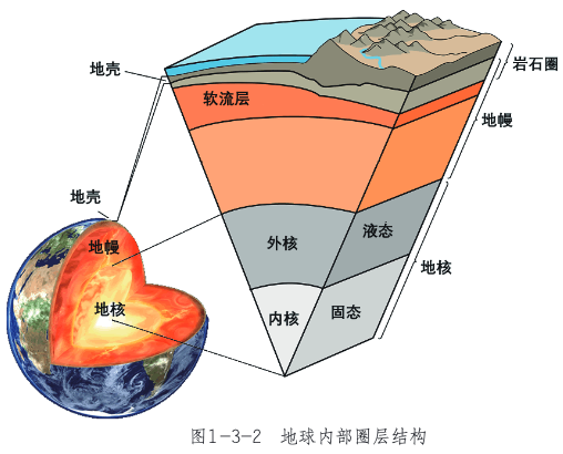 科学家在研究地球内部地震波传播速度的变化规律时,发现在地下平均约33千米处(大陆部分)和地下约2900千米处,地震波速度突然变化,由此推测其两侧物质有较大差异。人们以这两个界面为界,把地球内部划分为地壳、地慢和地核三个圈层。