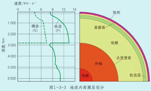 地震波在不同物质中的传播速度不同。根据地震波在地下不同深度传播速度的变化,可将地球的内部圈层分为三层:地壳地幔和地核。