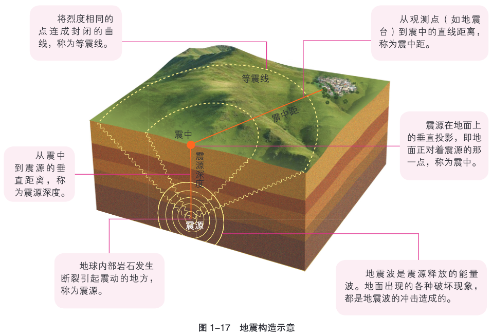 ① 地震发生时,地下岩石受到强烈冲击,产生弹性震动,并以波的形式向四周传播。
