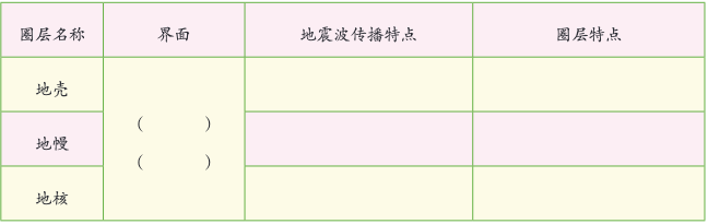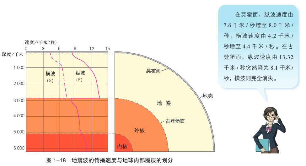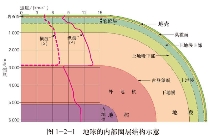 地球的内部结构,我们无法直接观察。科学家主要通过对地震波①的研究来了解地球的内部结构。地震波有纵波P波)和横波(S波)之分。纵波的传播速度较快,可以通过固体、液体和气体传播;横波的传播速度较慢,只能通过固体传播。纵波和横波的传播速度,都随着所通过物质的性质而变化。