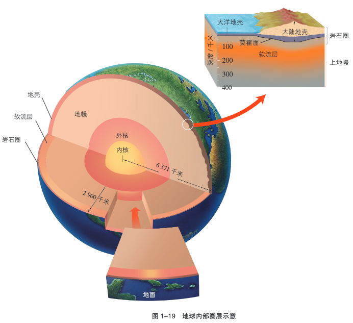 地壳是地球表面一层薄薄的、由岩石组成的坚硬外壳。它是一个连续圈层,平均厚度约为17千米,大陆部分较厚,大洋部分较薄。地幔介于莫霍面①与古登堡面② 之间,厚度约2 800千米。在地幔上部存在一个由塑性物质组成的软流层,该软流层一般被认为是岩浆的主要发源地。