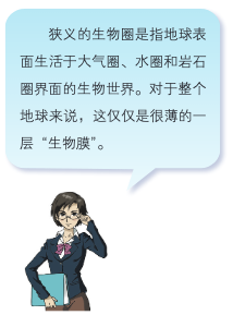 生物圈是地球上所有生物及其生存环境的总称。生物圈并不单独占有任何空间,而是分别渗透于大气圈的底部、水圈的全部和岩石圈的上部,厚度约 20 千米。但是,生物的绝大部分集中在地面以上 100 米到水面以下 200 米的范围内。这一薄层处在大气圈、水圈、岩石圈的接触带,可以说是生物圈的核心部分。