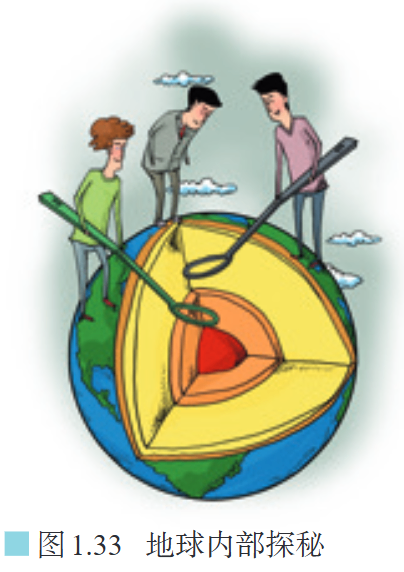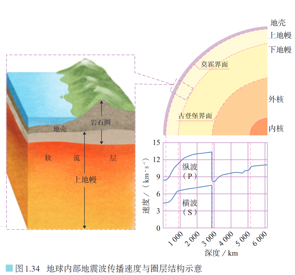 从地球内部地震波曲线图上,可以看出地震波在一定深度发生突然变化(图1.34)。这种波速突然变化的面叫不连续面。地球内部有两个不连续面:一个在地面下平均33千米处,在这个不连续面下,横波和纵波的速度都明显增加,这个不连续面叫莫霍界面②;另一个在地下约2 900千米处,在这里纵波的传播速度突然下降,横波完全消失,这个面叫古登堡界面③。以这两个界面为界,地球内部被划分为地壳、地幔和地核三个圈层。