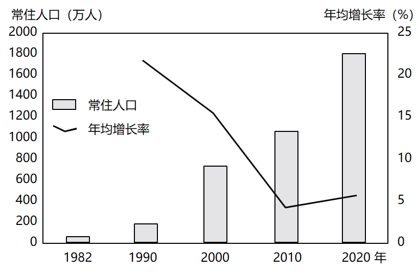 题目6.由图可知,1982-1990年,该市人口年均增长率在20%以上,这与深圳经济特区成立时间相吻合,之后,年均增长率虽有所下降,但仍保持较高水平。2010-2020年十年间,年均增长率在5%以上,人口继续保持较快增长,深圳作为全国改革开放的排头兵,坚持创新驱动发展,经济活力增强,经济总量位列全国大中城市前列,吸引了大量流动人口,十年间也沉淀了大量人口,因此B选项正确,A、C、D选项错误。